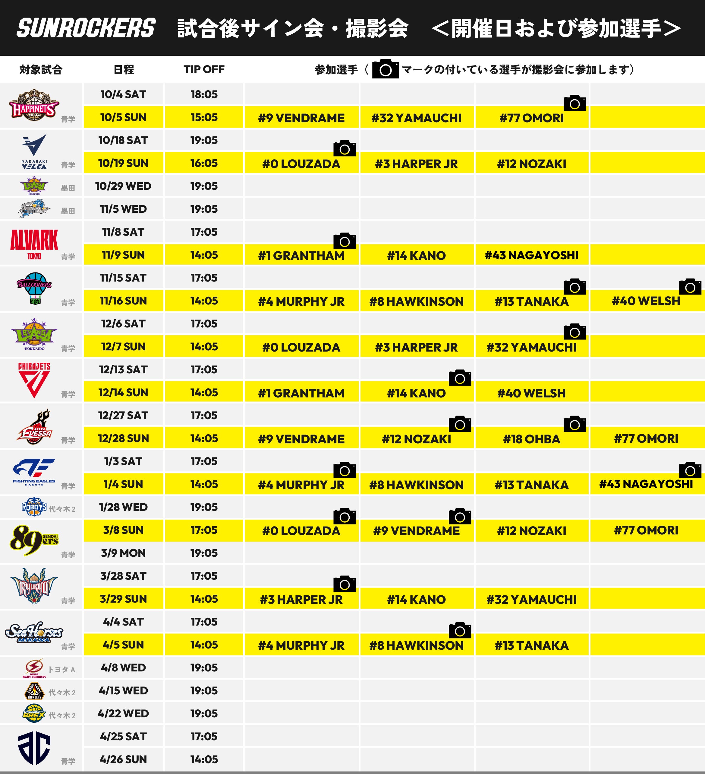 試合終了後、選手サイン会・撮影会を実施いたします。ファンクラブ会員(対象グレード:プレミア/ゴールド/パープル)は事前申し込みが可能です。選手1名につき定員30名となり、参加者は抽選にて決定いたします。