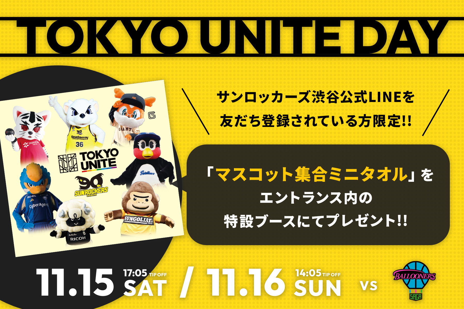 2025年11月15日(土)・16日(日)に青山学院記念館で開催される、佐賀バルーナーズ戦につきまして、「TOKYO UNITE」参加団体とのコラボレーション企画として、様々なマスコットが会場に集結します!