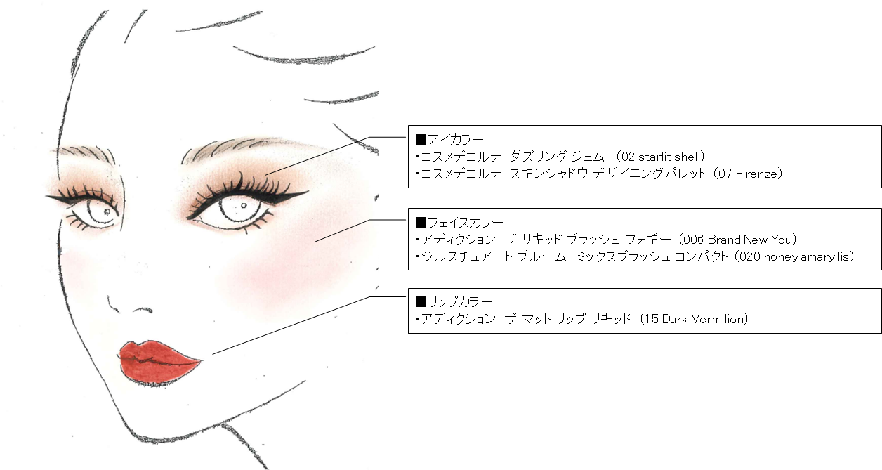輝度の高いアイカラ―を上まぶたと下まぶた(Cゾーン)にのせることで太陽の光をイメージし、上質な輝きとツヤが骨格を引き立てて立体感を演出しています。さらに、表情良く見せるために、チークを頬の高い位置からピンク系の色をふんわりとなじませています。