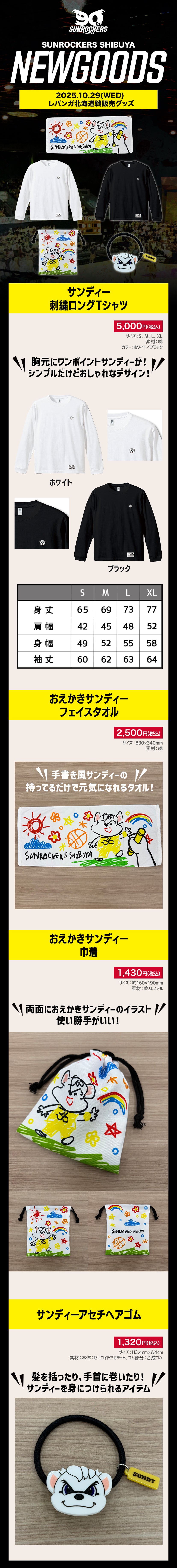 いつもサンロッカーズ渋谷を応援いただきまして、ありがとうございます。 2025年10月29日(水)に開催されるレバンガ北海道戦のオフィシャルグッズショップにて、新商品を販売いたします。 ぜひ会場でお買い求めください! 北海道戦試合情報/チケットはこちら りそなグループB.LEAGUE 2025-26シーズン試合情報 試合日時:2025年10月29日(水)19:05 TIP OFF 対戦カード:サンロッカーズ渋谷vsレバンガ北海道 会場:ひがしんアリーナ 試合情報はこちら チケットのご購入はこちら