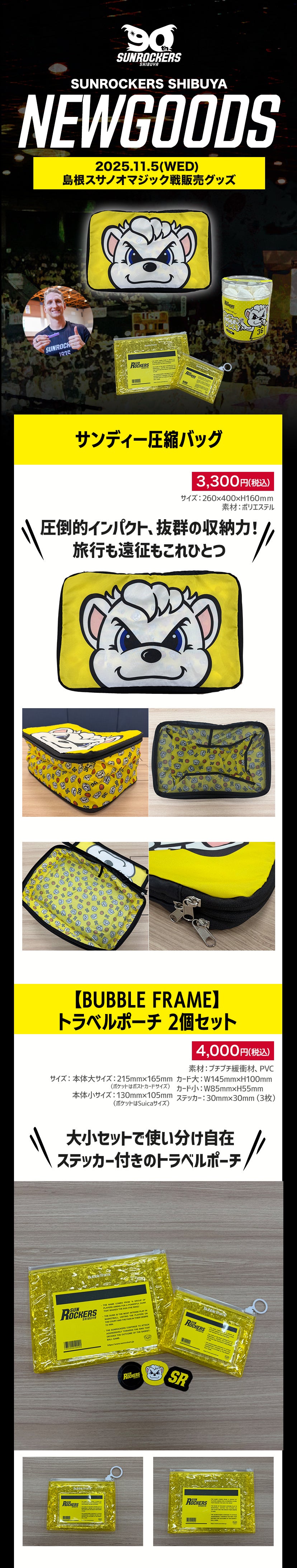 いつもサンロッカーズ渋谷を応援いただきまして、ありがとうございます。 2025年11月5日(水)に開催される島根スサノオマジック戦のオフィシャルグッズショップにて、新商品を販売いたします。 ぜひ会場でお買い求めください! 島根戦試合情報/チケットはこちら りそなグループB.LEAGUE 2025-26シーズン試合情報 試合日時:2025年11月5日(水)19:05 TIP OFF 対戦カード:サンロッカーズ渋谷 vs 島根スサノオマジック 会場:ひがしんアリーナ 試合情報はこちら チケットのご購入はこちら