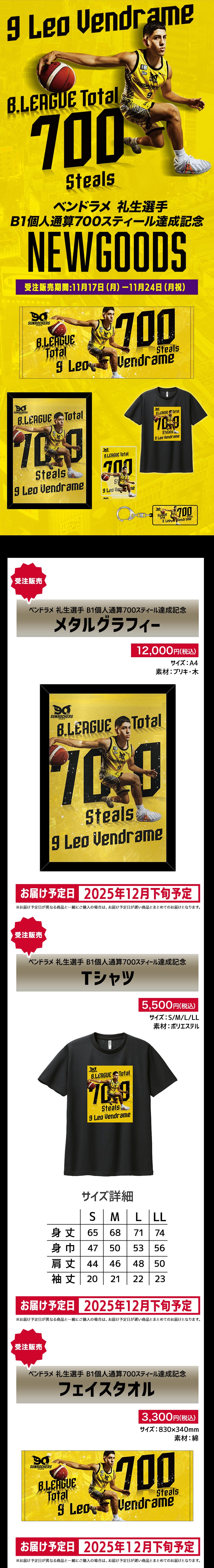 NEW GOODS 2025.11.17 【NEW GOOD】べンドラメ礼生選手B1個人通算700スティール達成記念グッズの受注販売を11/17(月)18:00より開始! いつもサンロッカーズ渋谷を応援いただきまして、ありがとうございます。 サンロッカーズ渋谷オフィシャルオンラインショップにて、べンドラメ礼生選手B1個人通算700スティール達成記念グッズの受注販売を11月17日(月)18:00より開始いたします。 【予約販売期間】 2025年11月17日(月)18:00 ~ 11月24日(月・祝)23:59 オフィシャルオンラインショップはこちら