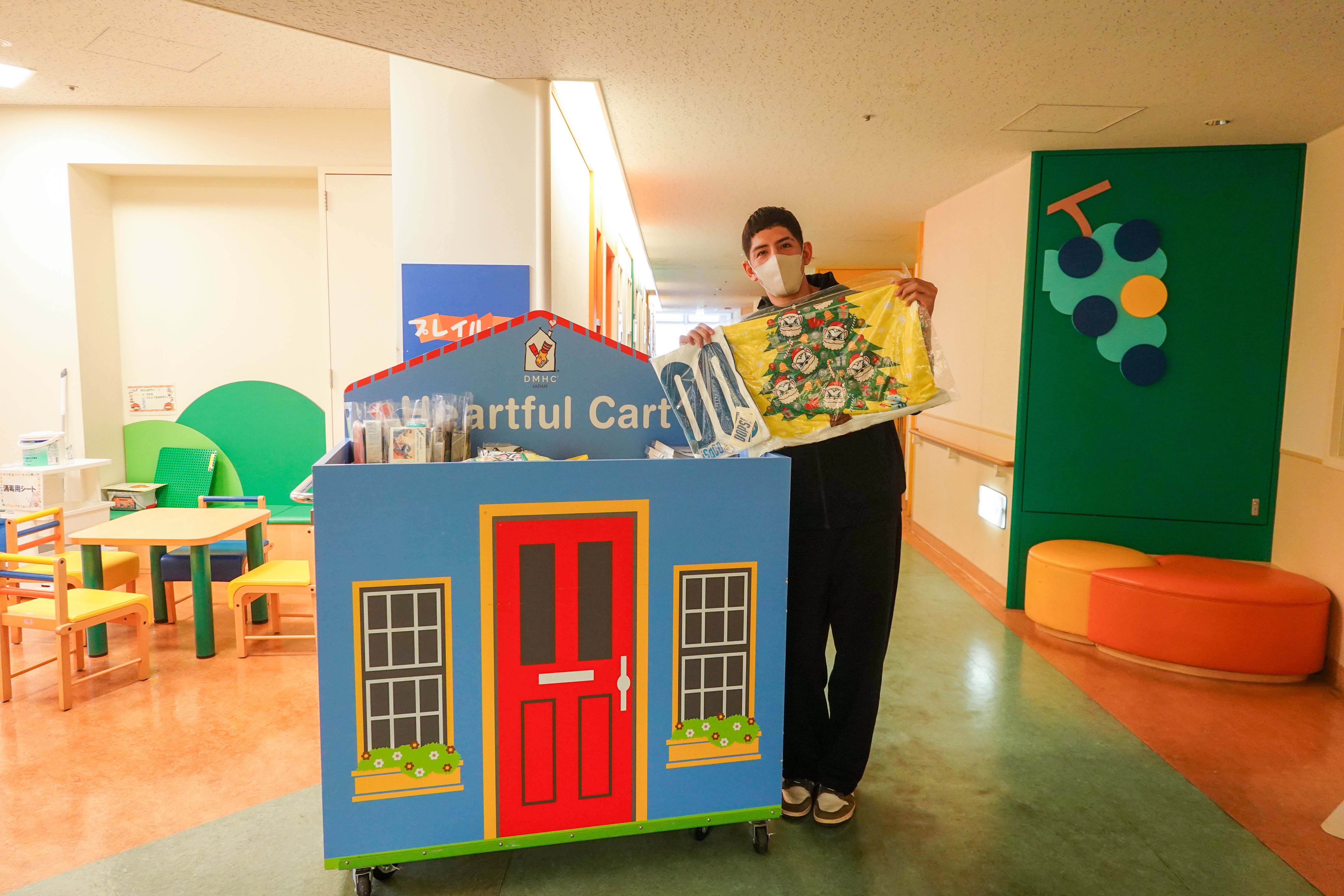 今回のハートフルカートには、サンロッカーズからオフィシャルグッズ、ベンドラメ選手からは選手本人の活動である「Oops!展」グッズ、そしてせたがやハウスからはご家族へ向けた化粧品などのアメニティを合計100点以上載せ、入院中の子どもたちとそのご家族へ配布いたしました。