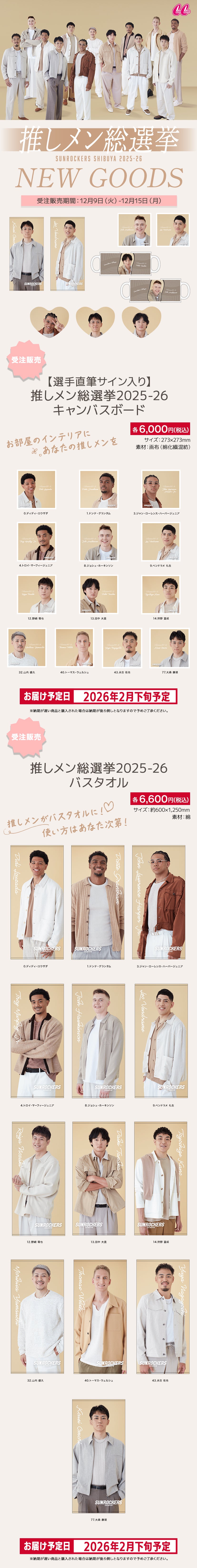 いつもサンロッカーズ渋谷を応援いただきまして、ありがとうございます。 サンロッカーズ渋谷オフィシャルオンラインショップにて、推しメン総選挙グッズの受注販売を12月9日(火)12:00より開始いたします。 【受注販売期間】 2025年12月9日(火)12:00 ~ 12月15日(月)23:59 サンロッカーズ渋谷オフィシャルオンラインショップはこちら 推しメン総選挙 特設サイトはこちら