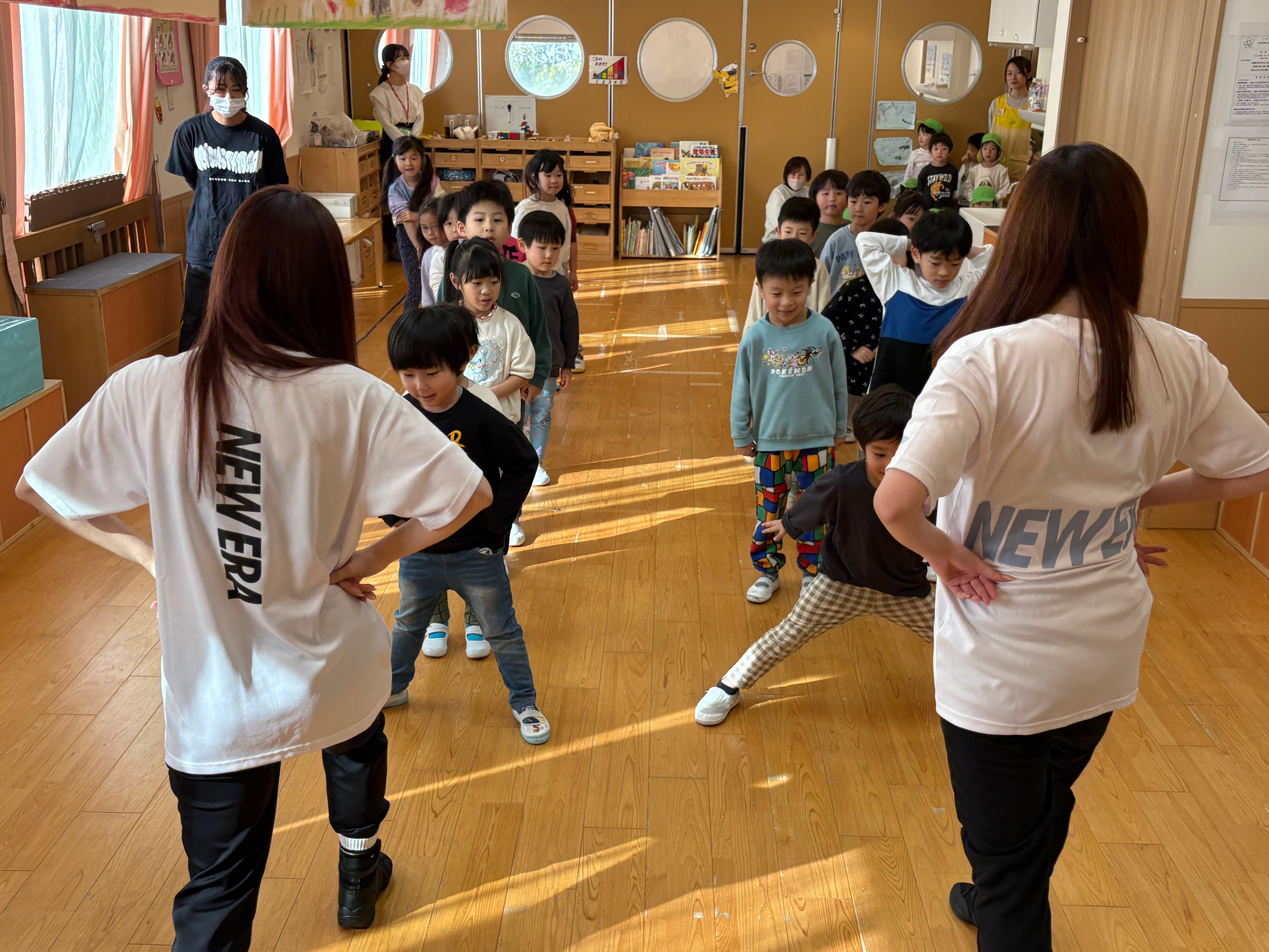 年中・年長の子どもたちを対象に、サンロッカーガールズのYUNAと428 ROCK CREWのMOMOKAによるダンスレッスンを実施。「笑顔・元気よく」「あきらめない気持ち」「ダンスを楽しむ気持ち」の3つの目標のもと、楽しくダンスに挑戦しました。