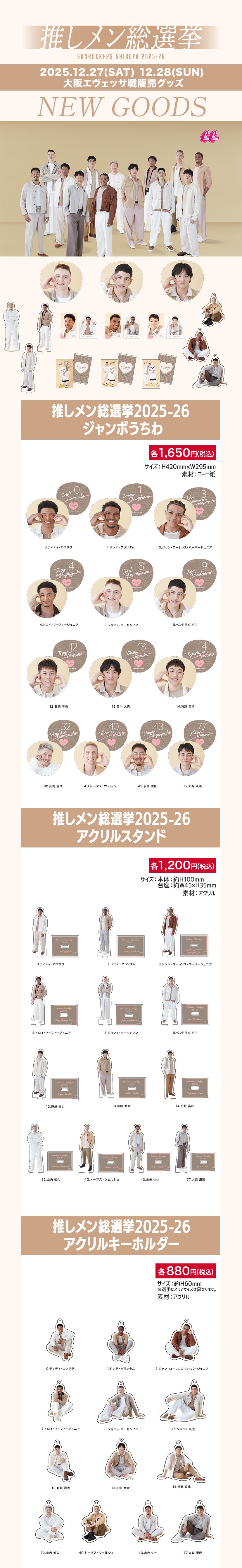 NEW GOODS 2025.12.19 【NEW GOODS】12/27(土)・12/28(日)大阪エヴェッサ戦販売開始 推しメン総選挙2025-26グッズ販売のお知らせ いつもサンロッカーズ渋谷を応援いただきまして、ありがとうございます。 2025年12月27日(土)・28日(日)に開催される大阪エヴェッサ戦のオフィシャルグッズショップにて、新商品を販売いたします。 ぜひ会場でお買い求めください! 推しメン総選挙 特設サイトはこちら りそなグループB.LEAGUE 2025-26シーズン試合情報 試合日時:2025年12月27日(土)17:05 TIPOFF・28日(日)14:05 TIPOFF 対戦カード:サンロッカーズ渋谷 vs 大阪エヴェッサ 会場:青山学院記念館 試合情報はこちら