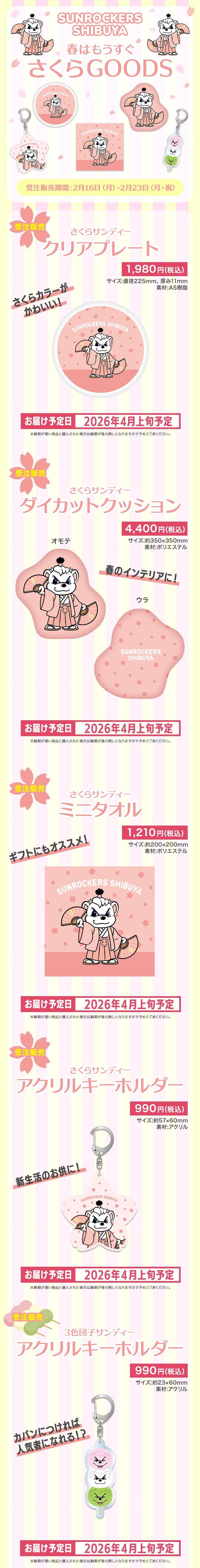 いつもサンロッカーズ渋谷を応援いただきまして、ありがとうございます。 サンロッカーズ渋谷オフィシャルオンラインショップにて、さくらグッズの受注販売を2月16日(月)12:00より開始いたします。 【受注販売期間】 2026年2月16日(月)12:00 ~ 2月23日(月・祝)23:59 サンロッカーズ渋谷オフィシャルオンラインショップはこちら