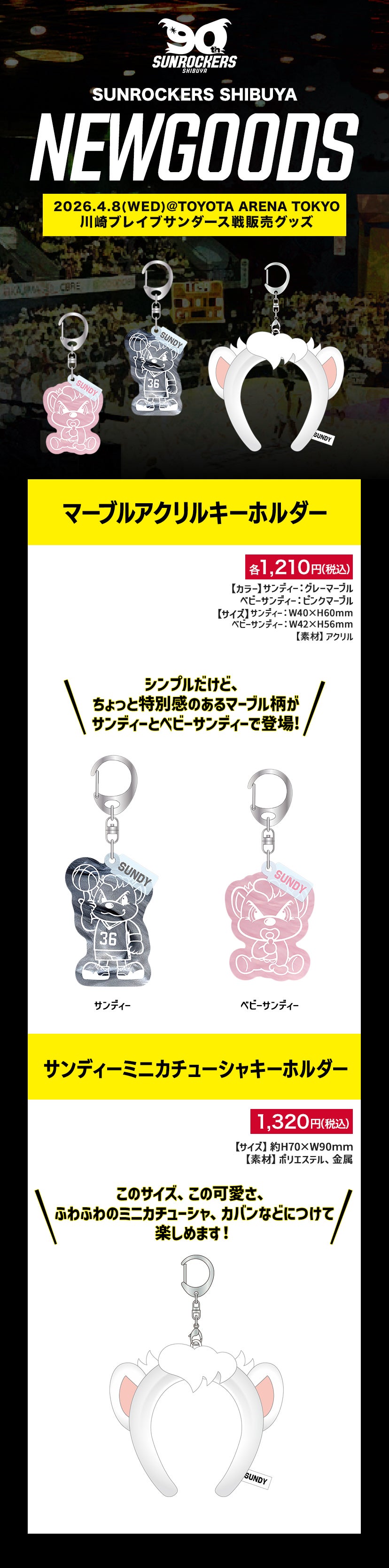 NEW GOODS 2026.04.02 【NEW GOODS】4/8(水)川崎戦販売開始 新商品のお知らせ いつもサンロッカーズ渋谷を応援いただきましてありがとうございます。 2026年4月8日(水)に開催される川崎戦のオフィシャルグッズショップにて、新商品を販売いたします。 ぜひ会場でお買い求めください! 川崎戦試合情報はこちら さらに当日はTOYOTA ARENA TOKYO 4Fにガチャブースを設置いたします。 専用メダルをレジにてご購入し、お楽しみください。 販売価格:1回 600円 販売場所:4F ■注意事項 スーパーレアのトートバッグは当たり券との引き換えとなります。 ショップスタッフまでお声がけください。 ※当日限り有効 ※選手ランダム りそなグループB.LEAGUE 2025-26シーズン試合情報 試合日時:2026年4月8日(水)19:05 TIPOFF 対戦カード:サンロッカーズ渋谷 vs 川崎ブレイブサンダース 会場:TOYOTA ARENA TOKYO 試合情報はこちら