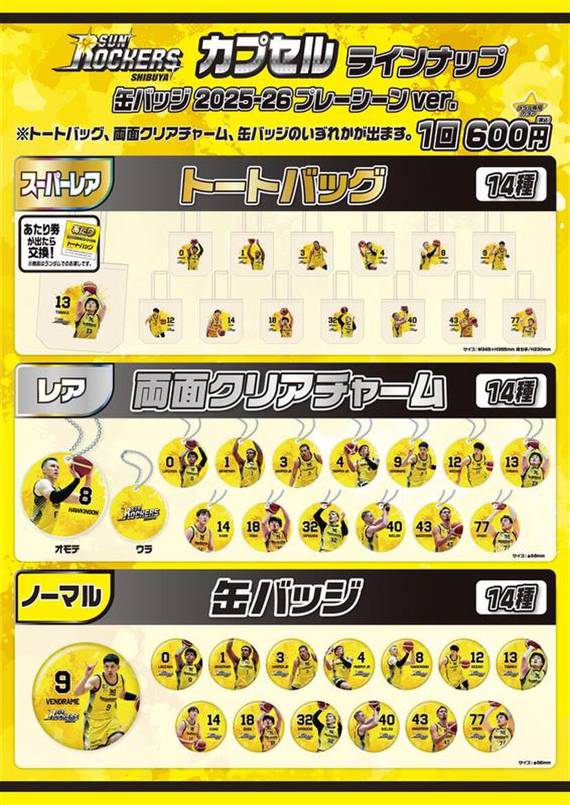 いつもサンロッカーズ渋谷を応援いただきましてありがとうございます。 2026年4月8日(水)に開催される川崎戦のオフィシャルグッズショップにて、新商品を販売いたします。 ぜひ会場でお買い求めください! 川崎戦試合情報はこちら さらに当日はTOYOTA ARENA TOKYO 4Fにガチャブースを設置いたします。 専用メダルをレジにてご購入し、お楽しみください。 販売価格:1回 600円 販売場所:4F ■注意事項 スーパーレアのトートバッグは当たり券との引き換えとなります。 ショップスタッフまでお声がけください。 ※当日限り有効 ※選手ランダム りそなグループB.LEAGUE 2025-26シーズン試合情報 試合日時:2026年4月8日(水)19:05 TIPOFF 対戦カード:サンロッカーズ渋谷 vs 川崎ブレイブサンダース 会場:TOYOTA ARENA TOKYO 試合情報はこちら