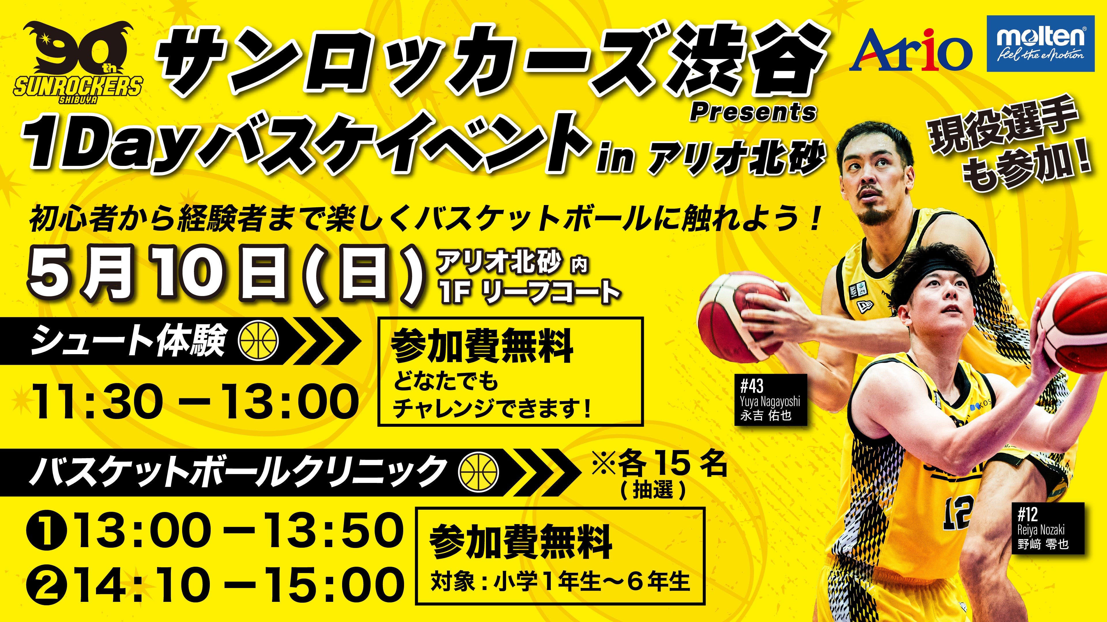 5月10日(日)アリオ北砂1Fリーフコートにて小学1~6年生を対象としたバスケ体験クリニック(事前申込制)を開催いたします。当日はサンロッカーズ渋谷より、#12 野﨑零也選手、#43 永吉佑也選手もゲスト参加予定となっており、選手と交流しながら初心者から経験者まで楽しめる内容となっております。この機会にぜひご参加ください。